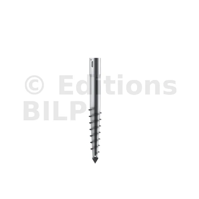 - à l’une des extrémités une pointe “harpon” surmontée d’une partie en spirale pour pouvoir creuser le sol,