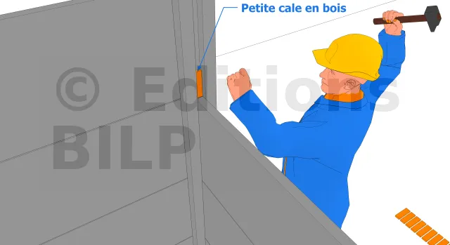 Pour ce faire, vous allez tout d’abord tirer la plaque de béton d’un côté et à l’aide d’un marteau, vous allez y insérer les petites cales en bois en vous assurant qu’elles sont bien en place entre les poteaux.