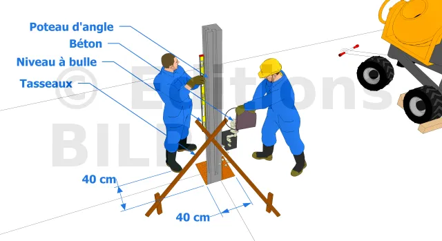 - Ensuite, pour le scellement, vous devrez procéder comme pour le poteau d’angle. La hauteur de ce dernier sera réglée par rapport au poteau d’angle.