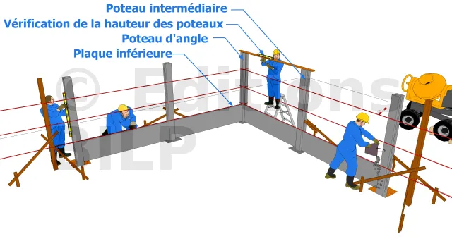 - Par la suite, vous allez procéder exactement de la même façon pour la mise en place des autres poteaux intermédiaires. Il est à noter que lors cette étape, vous ne devez placer que les plaques inférieures. En effet, il faut que le béton soit totalement sec avant de pouvoir mettre en place les autres plaques.