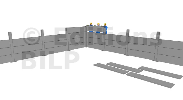 Les joints se font à l’aide de petites cales en bois insérées entre chaque plaque de béton et les poteaux intermédiaires.