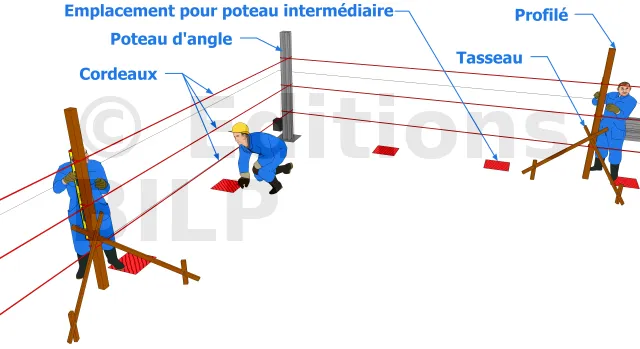 - Tirer trois ou quatre cordeaux entre le poteau d’angle et le profilé en bois. La hauteur du premier cordeau devra être sensiblement égale à la largeur de vos plaques pour faciliter davantage les opérations qui vont suivre. L’écartement des cordeaux devra toujours être le même.