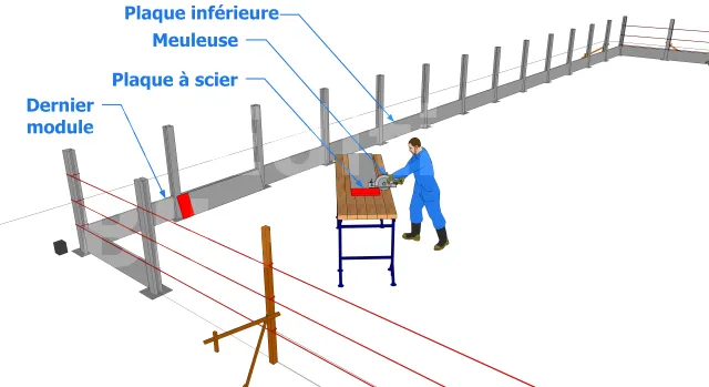 Habituellement, les dernières plaques qui constituent le dernier module devront être coupées. Pour cette opération, vous devez impérativement vous munir de vos lunettes de sécurité avant d’utiliser la meuleuse. Pour faciliter la coupe, la meuleuse devra être montée avec un disque diamanté.