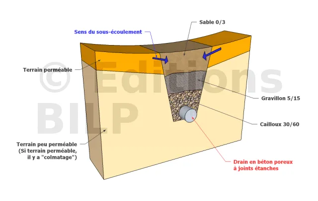 - La technique traditionnelle consiste à remplir la tranchée drainante avec des matériaux de granulométries différentes. Il faut cependant s’assurer que les matériaux qui entourent le drain ne vont pas l’obstruer. Par ailleurs, il est à préciser que cette technique n’est réalisable que si les eaux retenues par la tranche drainante circulent en surface ou sur la partie supérieure de la tranchée.