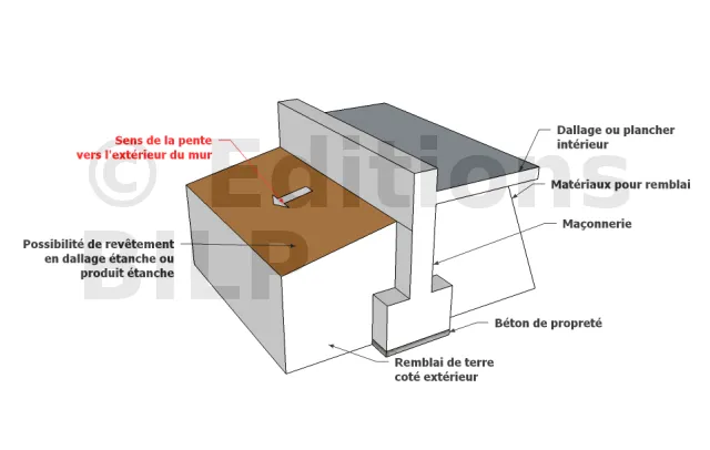 - Solution 6 : le drainage, Il existe plusieurs techniques de drainage selon que l’on souhaite empêcher l’eau de s’infiltrer jusqu’aux fondations et aux murs ou que l’on souhaite empêcher l’eau de s’infiltrer dans les maçonneries, surtout au niveau des murs des locaux habités.