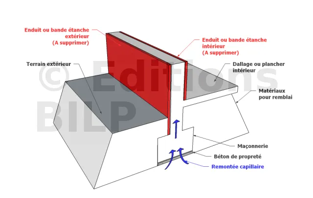 Quand le sol est humide, l’eau s’infiltre alors dans la maçonnerie et remonte par capillarité le long du mur.