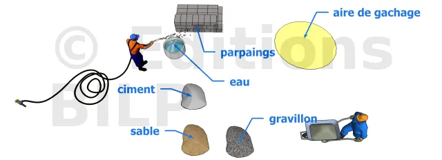 - le mortier qui comprend le sable, le gravillon, le ciment et l’eau
