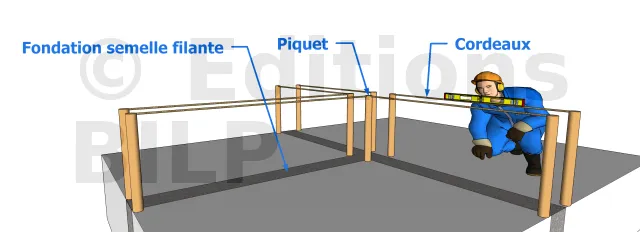 - On pose les parpaings extrêmes pour servir de référence et pour guider le cordeau. Il faut qu’ils soient bien aplomb et à niveau. Ensuite, on plante les piquets sur les angles et en intermédiaire si la distance couverte est trop grande.