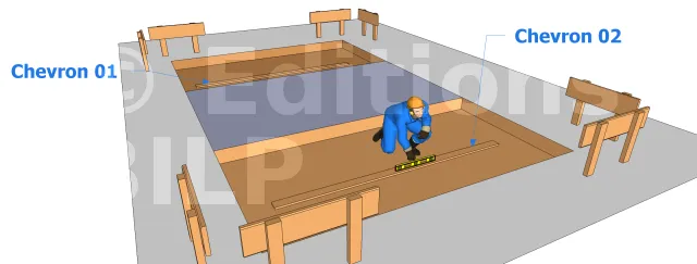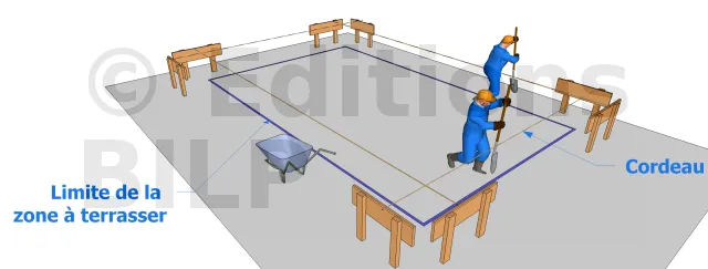 Pour préparer le terrain, il est préférable de commencer par un côté. Une fois que le niveau de profondeur est atteint, calez-le pour qu’il soit de niveau. Ensuite, attaquez l’autre extrémité et placez un deuxième chevron. Ensuite creusez la partie centrale pour placer un troisième chevron qui reposera sur les deux premiers. Enfin vérifiez que le terrain est bien nivelé en posant un niveau sur le troisième chevron.