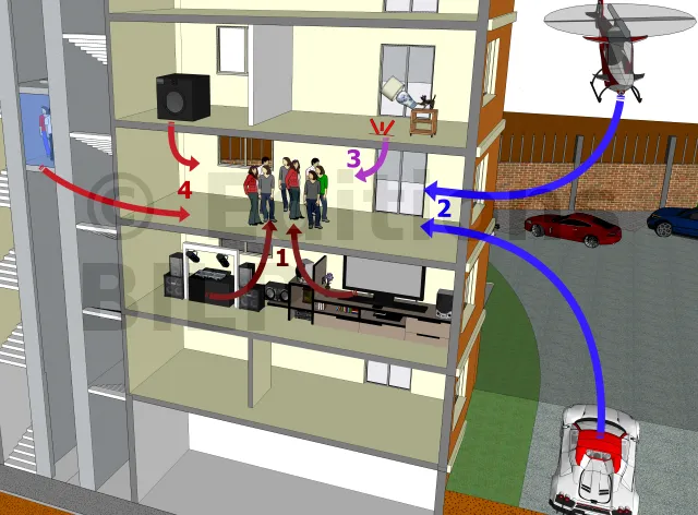 - les bruits aériens extérieurs qui sont émis à l’extérieur de l’immeuble et qui se propagent dans l’air (circulations, trains, avions...),