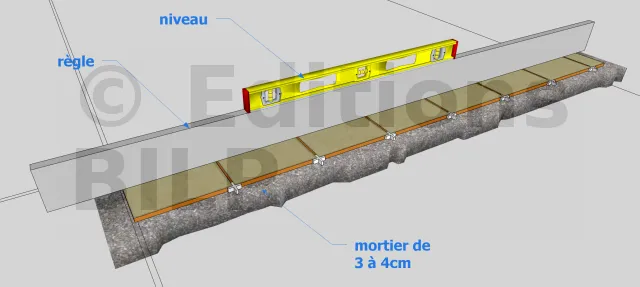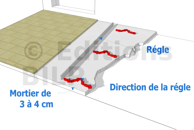 Il se pourrait que lors du coulage de la dalle de béton, des différences de niveau soient apparues. Or les tomettes ne peuvent pas résister à un dénivellement. C’est pour cette raison qu’il faut aplanir la surface afin que le mortier adhère bien le dallage. Pour ce faire, il faut réaliser un glacis. Il faut alors préparer une quantité suffisante de mortier afin d’égaliser la surface que vous avez à carreler. Il est conseillé de réaliser un glacis plus liquide qu’un mortier classique afin de permettre un lissage régulier. Ensuite, il faut déverser le mortier par portions. Puis, prenez une truelle ou un platoir en inox pour le lisser.