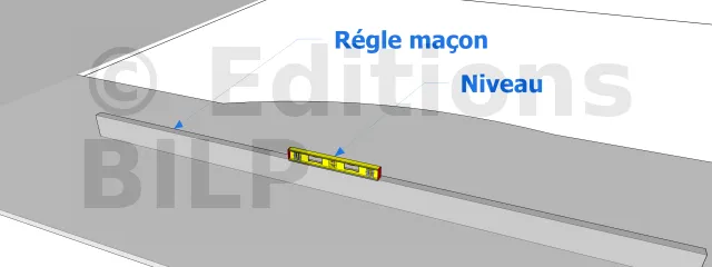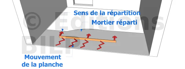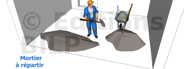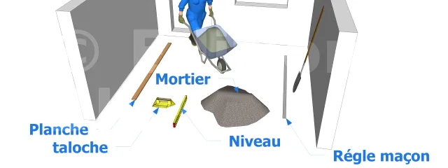 Pour mettre en place une chape traditionnelle, il faudra avant tout tracer la limite horizontale de la chape. On conseille une épaisseur de 4 cm, mais ce critère dépend avant tout de la limite des portes. Répartissez votre mortier en commençant par le côté opposé à la porte. Tirez le mortier avec une planche bien droite avant de le talocher. Vous accélérerez ainsi la cadence de travail.