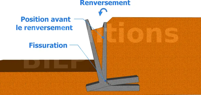 Ce phénomène est le fait du pivotement du mur par rapport à son sol d’assise. En effet, comme il est indiqué sur l’image, la résistance du sol s’oppose au renversement. Cette résistance étant amplifiée du fait que l’emprise ou la surface sur laquelle elle agit est plus grande. - Le tassement