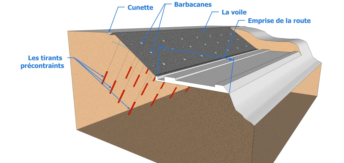 La paroi ancrée est un ouvrage en déblai composé de voile en béton armé, de tirants d’ancrages précontraints et dans le cas des poutres ancrées d’une paroi architecturale en béton armé et de terre végétale pour plantation.
