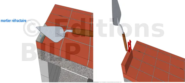 Etant donné que le mortier réfractaire est à prise rapide, il faut réaliser rapidement les joints. Il faut s’assurer que les joints sont denses quand vous bourrez les intervalles. Le jointoiement doit être réalisé depuis la base jusqu’au somment en s’assurant que les niveaux ne soient pas déréglés.