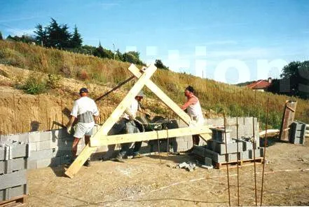 Le Mur a été réalisé avec des blocs à bancher de 27cm de large, sorte de parpaings creux que l’on pose à sec sans mortier et que l’on remplit de béton. Au fur et à mesure de la pose des blocs, on dispose des tores horizontaux et verticaux.