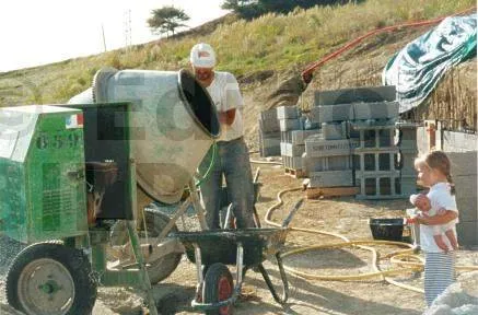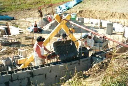 La semelle a été coulée au camion-toupie mais les blocs ont été remplis par du béton réalisé sur place. C’est un travail de bête. Il aurait été préférable de remplir avec un camion-pompe mais le coût en est très élevé. Il faut aussi savoir qu’on ne peut pas remplir plus de 5 à 6 rangées de blocs car au dessus, il y a un risque que les blocs inférieurs éclatent sous la pression du béton. Donc, suivant la hauteur du mur, on remplit en plusieurs étapes. Les locations successives de camion-pompe peuvent alors faire grimper la facture d’où mon choix de le faire à la main.